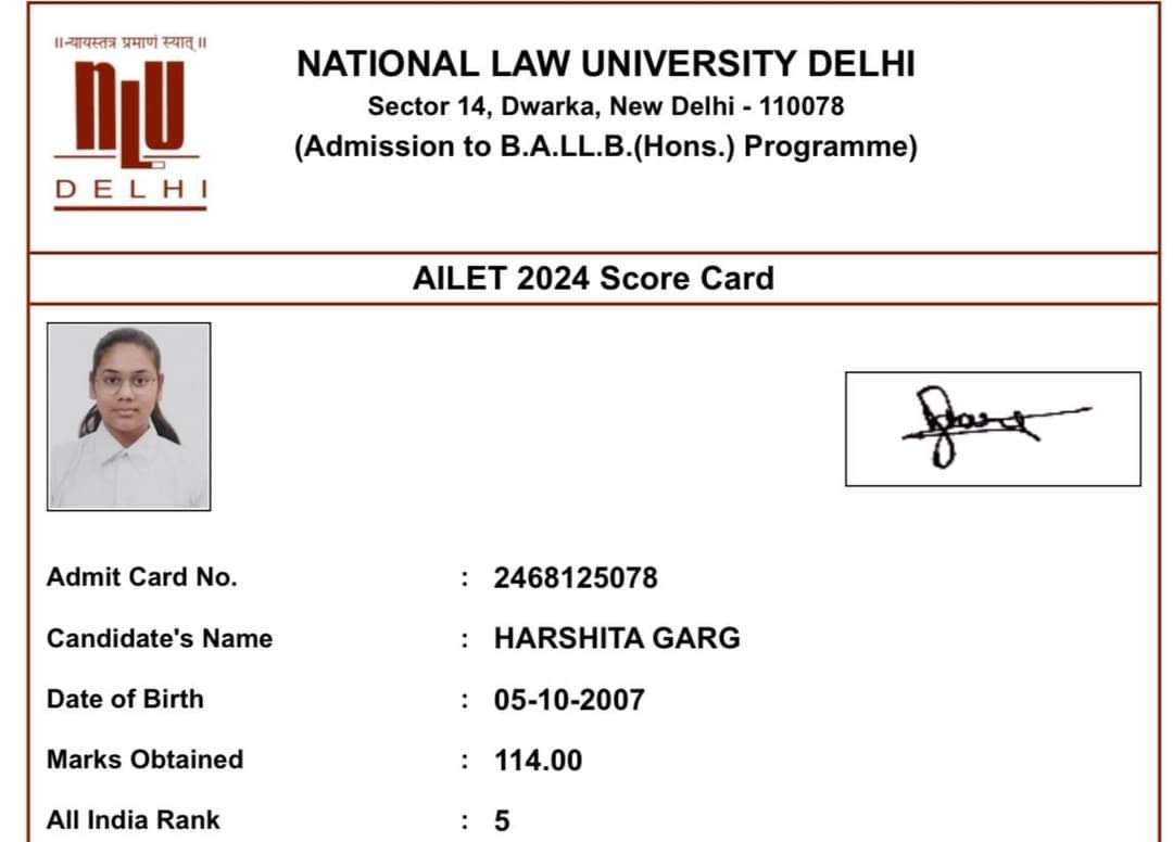 शहर के हुडा सेक्टर 1 निवासी हरगोविंद गर्ग की पौती हर्षिता गर्ग पुत्री नवल गर्ग ने देश भर में आयोजित ऐलेट परीक्षा में पांचवा स्थान प्राप्त किया है । यह परीक्षा नेशनल लॉ यूनिवर्सिटी, नई दिल्ली के एडमिशन के लिए 10 दिसंबर को पूरे देश में आयोजित कि गई थी। जिसमे लगभग 18,000 परिक्षार्थियों ने भाग लिया था । जिसमे हर्षिता गर्ग ने पांचवा स्थान प्राप्त किया है ।